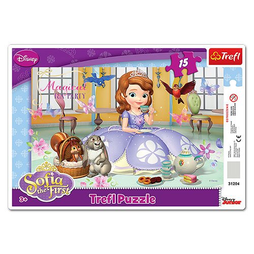 Пазл "Время чаепития" из серии "София Прекрасная" от бренда Trefl состоит из 15 элементов. Собрав их воедино, можно увидеть красочную и веселую картину, на которой изображена принцесса София, кролик Клевер и другие зверюшки. Чаепитие - очень важная церемония для королевских особ; соберите пазл вовремя и помогите принцессе не опоздать на это важное мероприятие.