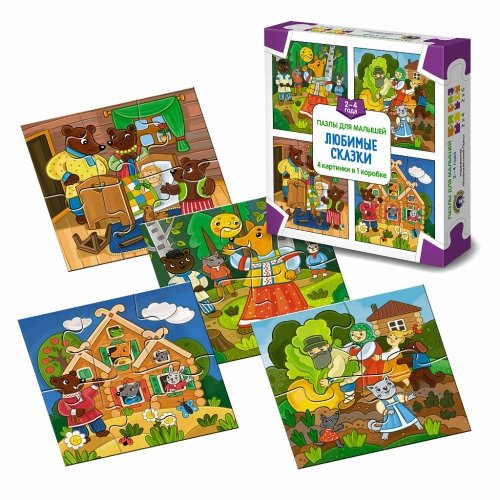 "Любимые сказки" – состоят из четырех картинок-иллюстраций русских народных сказок "Репка",  "Теремок", "Колобок", "Три медведя", сборка которых несомненно увлечет в игру ребенка надолго и с восторгом, подарив при этом массу положительных эмоций.