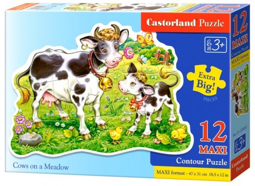 Макси-пазл "Коровки на лугу" изготовлен из плотного картона и изображает симпатичную корову и теленка, пасущихся на ярком зеленом лугу. Он предназначен для маленьких детей: элементы пазла достаточно крупные, чтобы ребенок не смог их проглотить. Пазл состоит из двенадцати элементов, которые складываются в довольно большую картинку. Ее можно использовать в качестве украшения детской, если приклеить на плотную картонную основу.