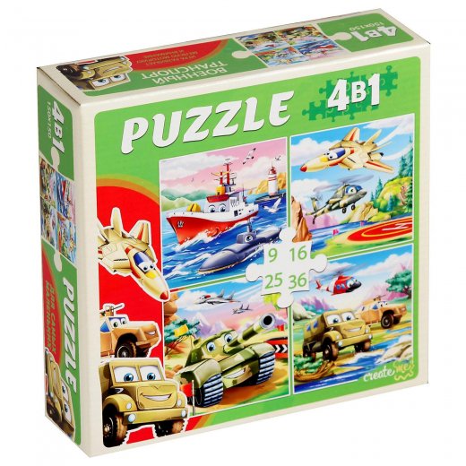 - Пазл 4 в 1 Военный транспорт 9-16-25-36 дет