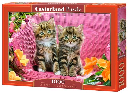 Пазлы Котята на стуле – станут отличным подарком для любителей кошек и тех, кто любит кропотливо собирать изображение из большого количества деталей. Пазл позволит собрать очень яркое и красивое изображение. Два пушистых полосатых котенка с очень яркими глазками сидят в розовом плетеном кресле. Их окружают цветы, и это придает картине насыщенность и завершенность. Пазл наверняка понравится любителям кошек, а также всем, кто получает удовольствие от сборки картин.