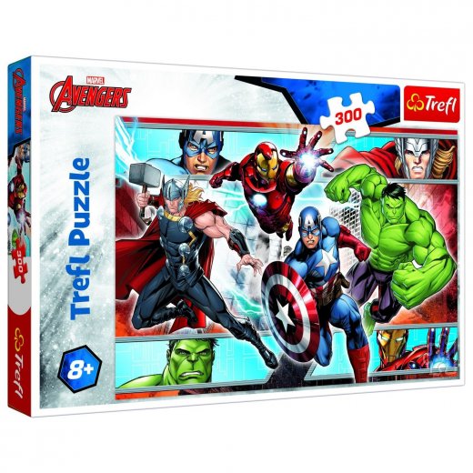 Пазлы на 300 элементов с изображением культовых Мстителей Марвел. В сложенном виде размер картинки составляет 60х40 см. Высокое качество, насыщенность цвета и безопасность укладки обеспечивается высококачественным светоотражающим картоном и использованием экологически чистых материалов.