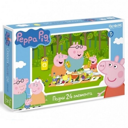 "Peppa Pig Пазл 24 элемента" состоит из 24 элементов, собрав которые вместе, ребенок увидит яркую картинку, показывающую, как Дружная семья Пеппы в составе мамы Свинки, папы Свина, Джорджа и, конечно же, самой Пеппы, главной героини мультсериала, отправилась на пикник, ведь это отличный способ провести время весело и интересно в летний денек! Они взяли с собой вкусный сок, фрукты, овощи, сыр и свежий салат. Расположились Пеппа и ее родственники в тени раскидистых деревьев, где их окружили дружелюбные птички.