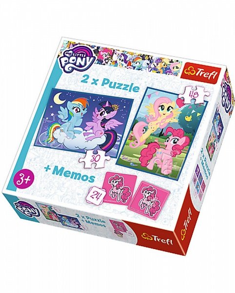 "Пазлы 2 в 1 мемо Дружба это магия" состоит из двух пазлов и игры Memos. Любимые герои мультсериала "My Little Pony" привлекут внимание юных непосед. На каждом из пазлов изображены чудесные пони: они отдыхают на облаке лунной ночью и резвятся на солнечной полянке.