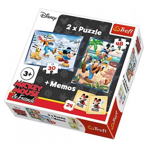Пазлы "Микки Маус 30 48 + мемо" настольная игра-головоломка создана по мотивам культового мультсериала "Микки Маус и его друзья". Она сочетает в себе пазл и мемо (игру на запоминание). Ребенку предстоит собрать 2 пазла с различными сюжетами из 78 общих элементов, а также потренировать свою память с 24 парными карточками мемо.