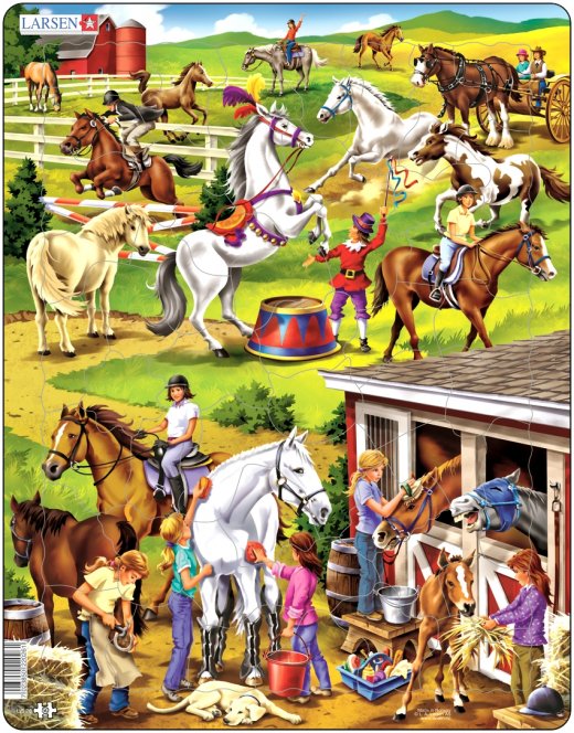 Пазлы Лошади – изображает коневодческое хозяйство, а также загон, внутри и вокруг которого ведутся работы по подготовке к предстоящим скачкам. Собирать такой пазл понравится детям, обожающим лошадей, а также тем, кто не боится многообразия мелких деталей и длительной, кропотливой работы.