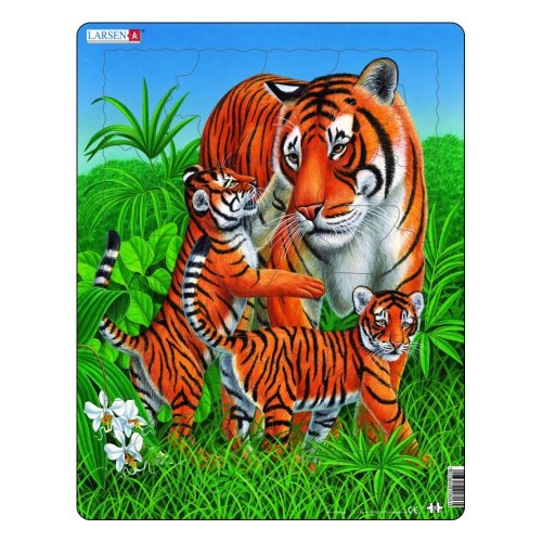 Пазл "Тигр" от бренда Larsen состоит из 23 элементов, изготовленных из качественного трехслойного картона. Из этих элементов ребенку нужно собрать картину с изображением тигрицы с двумя детенышами. Элементы крепятся на планшете из достаточно толстого картона. Планшет-основа пазла служит также и подсказкой к работе. Благодаря прослоенному картону, каждый элемент легко брать, а сам пазл прослужит ребенку долгое время.