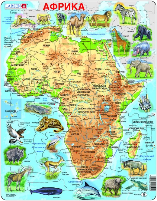 Красочный пазл норвежской фирмы Ларсен поможет ребенку интересно провести время и изучить страны, животных и очертания африканского континента. Русифицированный пазл состоит из большого количества элементов, на которые нанесены надписи крупных городов и изображения животных, рельефа, прибрежной территории. Пазл Ларсен Африка станет прекрасным дидактическим пособием на уроках географии и естествознания, поможет детям с большим увлечением заниматься дома дополнительными уроками в интересной форме.