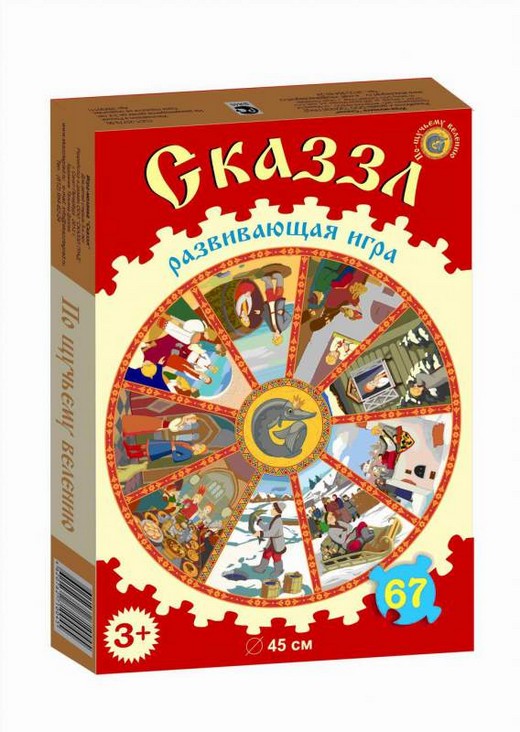 Сказзл "По щучьему велению" это новая развивающая игра для детей дошкольного и младшего школьного возраста, направленная на развитие у ребенка связанной речи и навыка пересказа. Игра выполнена в виде круглого пазла диаметром 45 см, с количеством элементов 67 штук. На сказзле изображено 9 ключевых сцен из сказки "По щучьему велению".