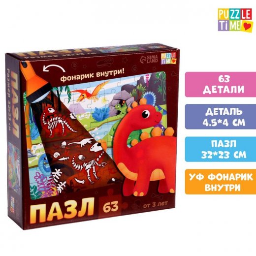Купить Пазл с фонариком «Динозаврики», 63 дет в Новосибирске Вы можете в магазине настольных и развивающих игр "Игры Почемучек"
