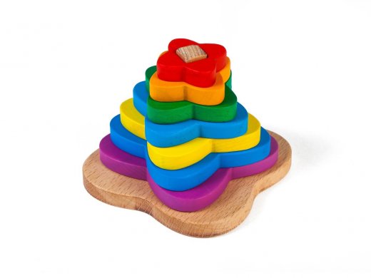 "Деревянная пирамида 1" с семью кольцами в виде четырехлистников разного размера и цвета, которые надеваются на стержень. Развивает моторику, логику, представление о частном как части целого, ребёнок изучает цвета, размер, понятие последовательности.
