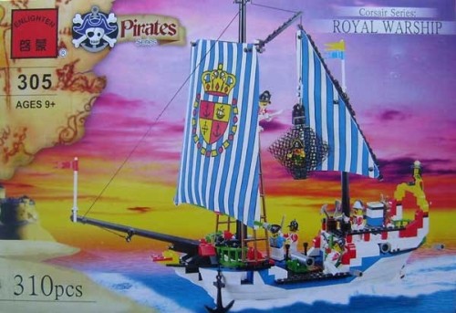 Можно собрать пиратский корабль с двумя стреляющими пушками, пиратскую крепость с маяком, причалом, клеткой для узника. У корабля разевающиеся паруса, сбрасываемый якорь. Двери кают-компании открываются. Аксессуары: пушки, ядра, другое оружие, весельная лодка, флаги, обезьянка, растения, штурвал с кратой, сундук с монетами, попугай, 6 фигурок человечков (капитан, боцман, 3 гвардейца, 1 пират).