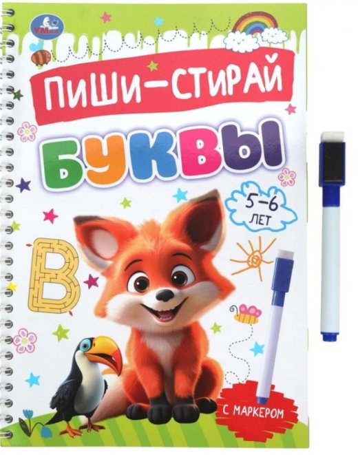 Прописи на спирали с маркером «Буквы, для детей 5-6 лет» из серии «Пиши-стирай» ТМ «УМка» - отличный тренажёр для развития графомоторных навыков: - занимательные задания - ламинированные страницы - возможность неоднократного использования - удобный формат - стираемый маркер в комплекте Серия прописей предполагает многоразовое использование. Все задания составлены с учётом рекомендаций психологов и представлены в игровой форме, что позволяет сформировать интерес к занятиям. Для большего удобства в комплекте уже предусмотрен маркер, на колпачке которого находится специальная губка для стирания написанного. Занятия с прописями ТМ «УМка» подготавливают руку к письму и способствуют развитию: - мелкой моторики рук - памяти - внимания - усидчивости Объём: 32 стр. Формат: 165 х 240 мм. Материал: офсетная бумага. Рекомендовано детям старшего дошкольного возраста.