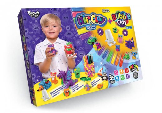 «BUBBLE CLAY» – это шариковый пластилин улучшенной формулы. Он состоит из маленьких пенопластовых шариков, скрепленных между собой клеевым составом. Детали очень легко присоединяются друг к другу, достаточно просто приложить одну к другой и они склеятся без малейших усилий. При высыхании фигурки из шарикового пластилина твердеют и остаются милыми забавными игрушками. «AIR CLAY» – это мягкий пластилин, который быстро застывает после лепки и остается твердым, но невероятно легким. Цвета смешиваются и детали легко соединяются между собой. Приятный на ощупь материал, не прилипает к коже и принимает любые формы.