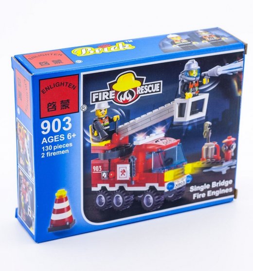 Конструктор "Пожарная машина 130дет" – состоит из 130 деталей, с помощью которых ребенок сможет собрать пожарную машину и команду из двух доблестных пожарных. Машинка получается хорошо детализированной. У нее большие колеса, детали, которые имитирую проблесковый маячок, кабина с рулем, а главное лестница для высоких домов и деревьев. Лестницей управляет один из пожарных, а второй смело взбирается на нее и тушит огонь, ведь в руках у него шланг с водой. После сборки конструктора у мальчика появится новая красочная игрушка, с которой можно инсценировать множество разных сюжетов.