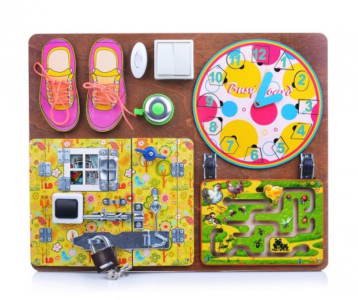 На доске Busy Board можно увидеть и оригинальный лабиринт, и большое количество различных замков, к которым нужно подобрать ключ, и выключатели разнообразной формы, куда можно нажать, и даже небольшой звонок, издающий забавные звуки. Все это позволит ребенку увидеть загадку в самых казалось бы обычных предметах домашнего обихода.