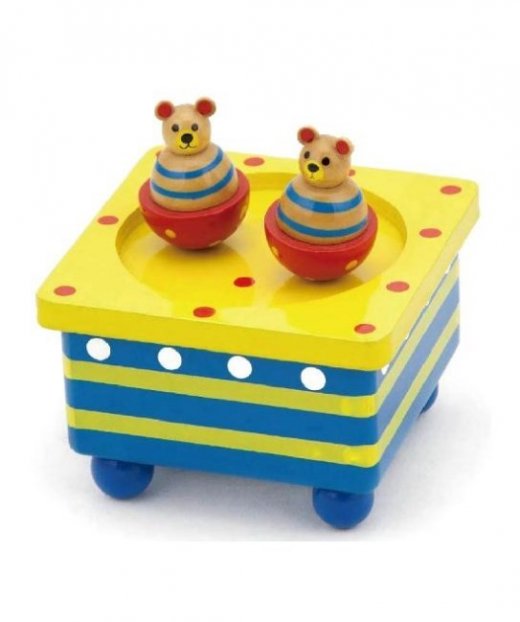 После того как ребенок покрутит специальный ключик, из шкатулки начнет играть приятная легкая музыка, однако это не все. В комплект к игрушке идет пара симпатичных мышат, внутрь которых вмонтирован небольшой магнит, если поставить зверьков на крышку шкатулки, они начнут кружиться в такт музыки.