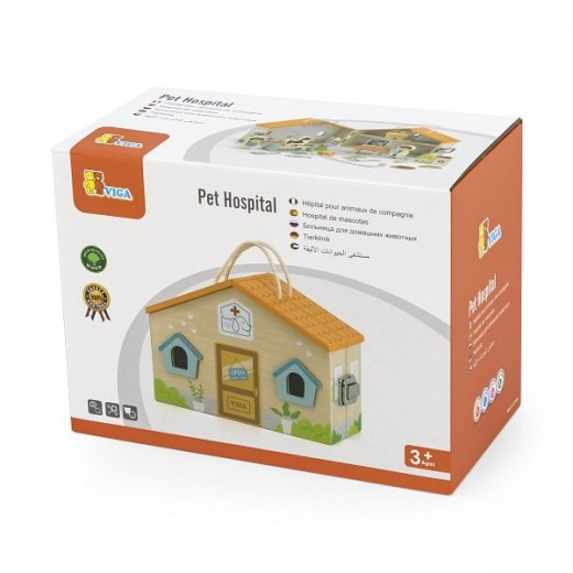 Игрушка состоит из двухэтажного деревянного строения "больница для домашних животных" с фигурками и моделями из дерева.