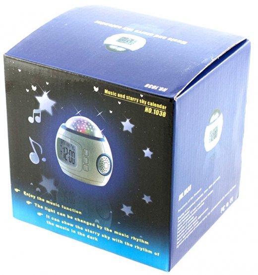 Часы Ночник проектор звездного неба - оснащены функциями календарь и электронный термометр. У часов 10 программ мерцания с различными успокаивающими полифоническими мелодиями. Выглядят часы как обычный шар, сверху которого расположена полусфера имитирующая звездное небо, по бокам расположены динамики.