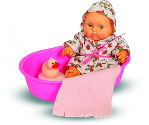 "Весна Карапуз Девочка в ванночке в пакете" - симпатичная розовощекая девочка. Кукла отличается потрясающей детализацией и обладает не только характерным для младенцев телосложением, но и анатомической деталью, указывающей на ее пол. В комплекте с пупсом юная мама получит ванночку, утенка, чтобы развлекать своего "малыша", цветастый халатик и банные принадлежности. Кукла полностью изготовлена из эластичного винила, ее можно купать, переодевать, усаживать и всюду брать с собой.