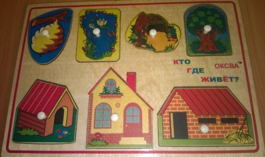 Планшет с вкладышами, на которых изображены "жилища" животных, насекомых и людей, а под вкладышами нарисованы "жильцы". Игровой материал позволяет установить соответствие между животным и местом его обитания.