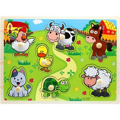 Вкладыши "Домашние животные" представляет собой деревянную дощечку со специальными углублениями, в которую вставляются вкладыши животных. Всего 7 вкладышей с изображением животных. Под каждым вкладышем есть аналогичная картинка-подсказка. В центре каждого вкладыша есть деревянная ручка для того, чтобы ребенку было удобнее вынимать и вставлять на место яркие картинки. Задача ребенка, основываясь на размерах и форме вкладыша подобрать для него нужное отверстие. Все детали игрушки изготовлены из экологически чистой древесины, они не токсичны, аккуратно обработаны по краям и абсолютно безопасны для детей.