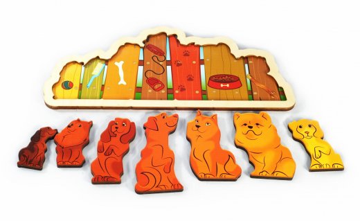 Играя, малыш узнаёт разные породы собак и особенности ухода за ними. Деревянные вкладыши обтекаемой формы безопасны для самых маленьких исследователей. В процессе игры ребенок знакомится с понятием "цветовые оттенки", учится складывать цельное изображение внутри предложенного контура. Занятие способствует развитию усидчивости и концентрации.
