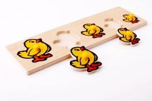 Рамки-владыши "Цыплята" представляет собой дощечку с вырезанными в ней отверстиями в форме цыплят разного размера. В каждое отверстие вставлена соответствующая фигурка - вкладыш. К каждому вкладышу крепится пластмассовая ручка, что упрощает процесс вынимания и вставки вкладыша. Задача ребенка, основываясь на размере вкладыша подобрать для него нужное отверстие.