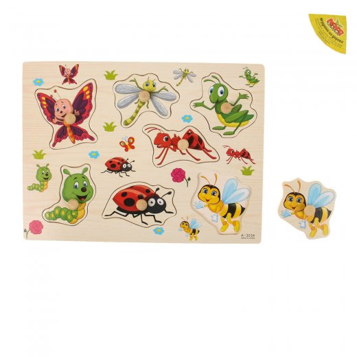 Рамка вкладыш Подбери картинку "Насекомые" состоит из красочной рамки с выемками, где ребенку следует разместить 7 фигурок-вкладышей в виде насекомых. Под каждым вкладышем аналогичная картинка-подсказка. Во время игры ребенку нужно вставить фигурки (вкладыши), соответствующие картинке или форме выреза. В центре каждого вкладыша есть деревянная ручка для того, чтобы ребенку было удобнее вынимать и вставлять на место яркие картинки. Гладкие, тщательно обработанные фигурки удобно держать в руках. Все детали игрушки изготовлены из экологически чистой древесины, они не токсичны, аккуратно обработаны по краям и абсолютно безопасны для детей.