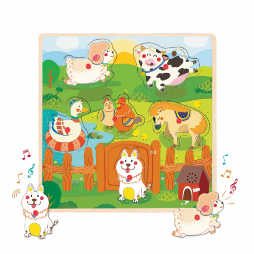 В состав игры входят игровое поле и 6 фигурок-вкладышей, оформленных в виде различных животных: уточки, курочек, коровки, лошадки, собачки и овечки. Малышу предстоит правильно расположить всех эти красочные фигурки в соответствующие им по форме контурные отверстия. А когда вкладыш окажется на своём месте, послышится звук, характерный для того или иного животного!