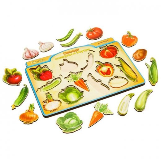 Двухслойный сортер с овощами, которые выглядят очень реалистично. Нижний слой - это половинки овощей (12 вкладышей), а верхний - целые овощи (ещё 12 вкладышей). Игра поможет объяснить ребенку понятия "часть и целое", "большой-маленький". Считайте овощи, изучайте их особенности: цвет, размер, где они растут и какие на вкус. Предложите ребенку  поиграть в повара и "приготовить" блюда из этого набора овощей.