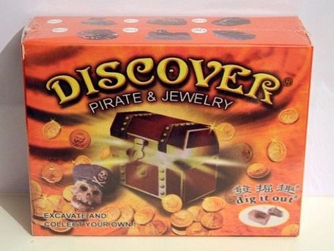 В этой коробке вы найдёте археологический набор, содержащий пласт окаменелой земной породы с пиратскими сокровищами.