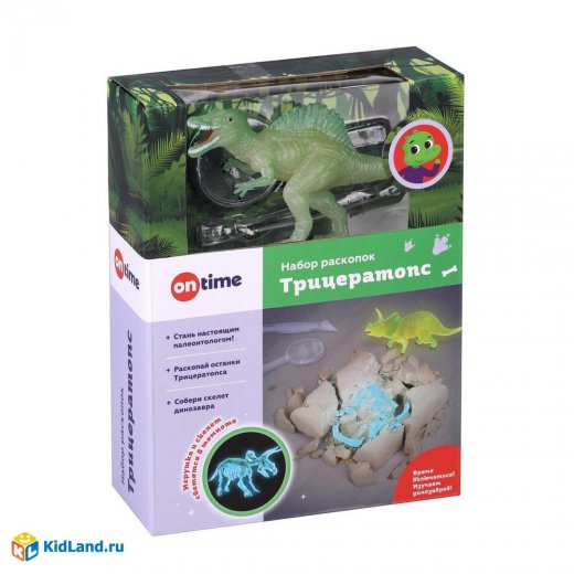 Набор для раскопок «Трицератопс» от ТМ “ON TIME” поможет ребёнку почувствовать себя в роли настоящего палеонтолога, изучающего древних динозавров. Юному исследователю предстоит раскопать останки Спинозавра и собрать скелет динозавра. Всё это очень интересно! К тому же, и игрушка, и скелет обладают одной очень эффектной способностью: они могут светиться в темноте.