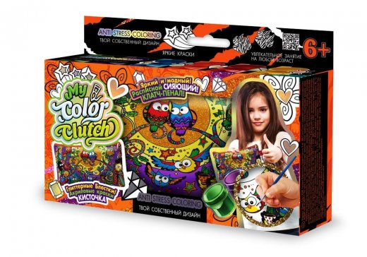 Состав набора: клатч-пенал, комплект из 6 акриловых красок, кисточка, глиттерные блестки, акриловый лак на водной основе, инструкция.