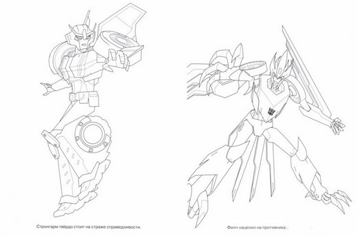 Раскраска "Трансформеры" целиком посвящена персонажам этих мультфильмов. На каждой ее странице нарисован один из персонажей. Все они нарисованы точно такими же, как выглядят на экранах телевизоров, точно соответствуя каноничным образам. Под каждой картинкой находится подпись, которая комментирует действия персонажа на данный момент.