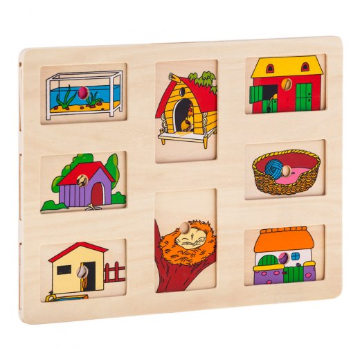 Ассоциация "Кто где живет?" познакомит Вашего любознательного малыша с местом обитания домашних животных и лесных жителей. В состав настольной игры "Кто где живет" входит 8 передвигающихся табличек, на которых изображены чьи-то аккуратные домики. Отодвигая карточки, ребенок узнает, что за животное живет в каждом из них. Кто прячется в будке, кто охраняет гнездо и кто плавает в аквариуме? На эти и другие вопросы ребенок получит ответ во время увлекательной игры! Для удобства малыша, каждая карточка имеет