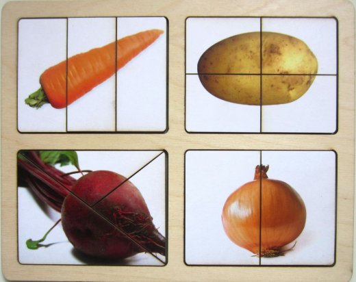 Собрать четыре изображения из подходящих деталей в углублениях на планшете. Так, например, картинка с картошкой собирается из четырёх деталей, картинка с морковкой – из трех деталей и т. д. Покажите своему малышу, как правильно это делать. Помогите ему вставить детальки на место.