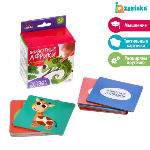 Развивающий набор Тактильные карточки.Животные Африки. В этой необычной игре есть множество тактильных элементов на карточках с животными. Они представлены вкладками, соответствующими поверхности тела каждого зверька.