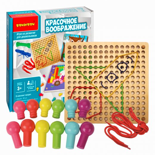 Увлекательная игра «КРАСОЧНОЕ ВООБРАЖЕНИЕ» из серии «БондиЛогика» от Bondibon познакомит вашего ребенка со счетом и навыками шитья, а также будет способствовать развитию цветовосприятия, логического мышления, мелкой моторики, воображения и пространственного мышления. Это игра 2 в 1, включающая в себя шнуровальный планшет и мозаику с карточками.
