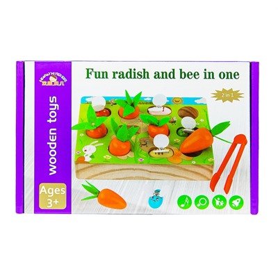 Игра представляет из себя рыбалку и объёмный вкладыш в виде грядки с морковью, ведь детки так любят стилизованные игрушки! Вытаскивать морковку мы можем пальчиками или щипцами для усложнения и лучшего развития координации, а мушки прекрасно достаются с помощью магнитных удочек, которыми можно орудовать сразу двумя. Играть можно как самому, так и в кругу семьи или с друзьями, соревнуясь на точность и скорость выполнения. В этой игре отлично изучаются количество, цвета, предметы и тренируем речь, помимо моторики и логики.