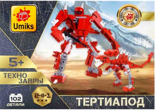 Технозавры – это грозные роботы-динозавры. В зависимости от настроения и желания каждый конструктор может быть собран или в динозавра или в робота. У каждого технозавра есть свое оригинальное боевое имя. Ведь известный факт: чем заковыристей имена, тем больше они нравятся мальчишкам. Это как отправная точка для старта их фантазии. Данный конструктор именуется Тертиаподом и собирается из 102 деталей. Задняя сторона упаковки призывает собрать серию из всех 5 технозавров. Ведь тогда можно создать большого непобедимого Мегабота.