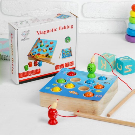 Рыбалка объемная "Морской мир" - развивающая игрушка для малышей. В комплекте деревянный пруд с отверстиями, в которых прячутся 10 разноцветных рыбок с магнитными головками и 2 удочки, тоже с магнитным наконечником. Задача простая: с помощью удочки поймать всех рыбок.