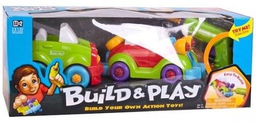 Игровой набор из серии Build & Play – набор для самостоятельной сборки игрушек. Он специально разработан для детей, поэтому собирать машинки крайне просто. Все детали достаточно крупные, а шуруповерт с отверткой совершенно безопасны. В коробке вы найдете разнообразные детали, из которых получатся 2 разные машинки, шуруповерт, который действительно закручивает шурупы (работает на батарейках), шурупы, отвертку и насадку к ней.