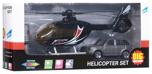 Набор игровой «Вертолет и машинка» Big Motors – отличное приобретение для увлекательной игры Вашего малыша и его лучшего друга. В набор входит вертолет со световыми и звуковыми эффектами и вращающимися лопастями винта, автомобиль и две бочки. При нажатии на пропеллер вертолета, у него включаются световые и звуковые эффекты. Каждый из видов транспорта Big Motors отличается высокой степенью детализации и будет долгое время радовать своего обладателя. Маленький затейник несомненно придумает множество интересных игровых сюжетов с набором. Теперь устроить головокружительные трюки с участием вертолета и машины проще простого!