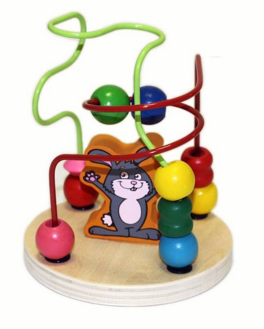 "Модуль малый деревянный"- представляет собой комбинацию из 2 разноцветных проволок, изогнутых в разных плоскостях и закрепленных на деревянном основании. Проволоки нельзя сгибать. На каждой проволоке нанизаны разноцветные деревянные бусинки. В лабиринте бусинки выполнены в виде различных геометрических фигур и окрашены в разные цвета. Фигурки можно перемещать по этим проволокам. Посередине лабиринта расположен задорный зайка. Игрушка выполнена из прочного и высококачественного дерева, безопасного для вашего малыша.