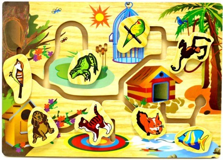 Лабиринт деревянный "Кто где живет-2"- игрушка, которая неизменно будет радовать вашего ребенка, а также способствовать полноценному и гармоничному развитию его личности. Лабиринт "Кто где живет-2"- это деревянное игровое поле, в котором проделана тропинка с извилистыми ходами. Каждый ход лабиринта ведет к жилищу какого-либо животного. На игровом поле имеется 8 нарисованных домиков и 8 подвижных деталей. На деталях изображены разные животные:  воробей, котенок, собака, рыба, белка, лягушка, попугай, обезьяна. Детали нужно двигать от домика к домику, отыскивая подходящее жилище: коврик для котенка, конуру для собаки, скворечник для воробья и т.д. Картинки на деталях яркие и красочные. Игрушка выполнена из прочного и высококачественного материала, поверхность которого не имеет шероховатостей и зазубрин, довольно стойкая к изнашиванию.