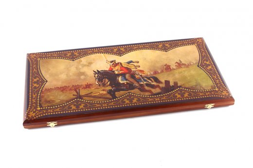 Нарды большие "Гусарские" - упакованы в деревянный кейс, оформленный изображением гусара на поле битвы. Кейс закрывается на металлический замок. Внутренняя часть кейса представляет собой игровое поле. В наборе имеются два игральных кубика и деревянные шашки. На внешней стороне в нижней части кейса изображено игровое поле для игры в шашки.