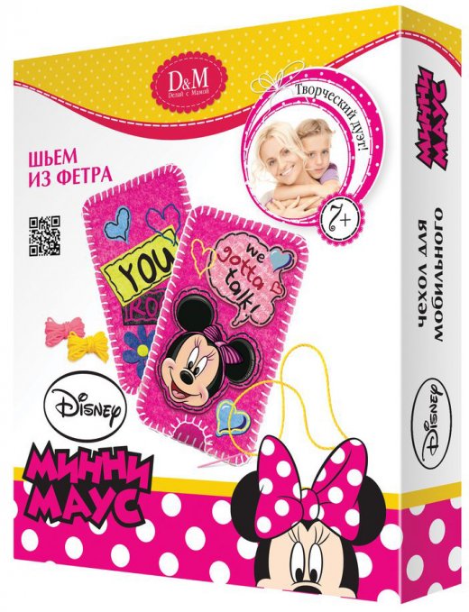Шьем из фетра "Минни Маус" - включает в себя все необходимое для создания модного и стильного чехла для телефона, дополненный яркими аппликациями и портретом героини мультфильма студии Дисней – Минни Маус. Соединить фетровые детали очень легко, так как они предварительно подготовлены и в них уже есть отверстия для нити. Шитье осуществляется при помощи специальной безопасной иглы. Чехол прекрасно подойдет для повседневного использования и станет удобным аксессуаром для хранения сотового телефона.