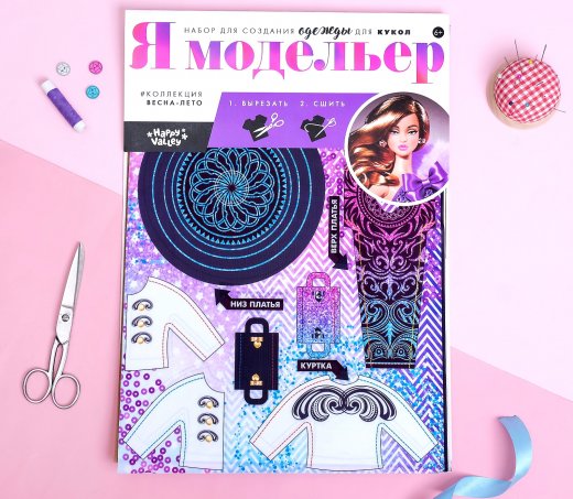 Набор «Я модельер» — настоящий клад для юной модницы! Девочки с лёгкостью смастерят дизайнерские наряды на свой вкус как профессиональные кутюрье. В набор входят лекала будущей одежды, ткань и инструкция с основами швейного мастерства. Чтобы получить красивый наряд, нужно вырезать все детали по линии среза, затем сложить одинаковые части лицевой стороной внутрь, закрепить их булавками. Сшить детали, отступив от края 2 мм, вывернуть. Наряд готов!