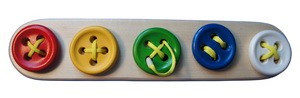 "Пуговицы-шнуровки" представляет собой набор, состоящий из шнурка с деревянным наконечником, в качестве иглы, и фиксатором; пяти пуговиц, в которых есть по четыре отверстия для вдевания шнурка. В ходе игры ребенку предлагается "пришить" пуговицы к дощечке. Для этого на ней предусмотрены специальные дырочки того же диаметра, что и у самих пуговиц. Разноцветные пуговицы можно зашнуровывать в таком порядке, в каком малыш пожелает.